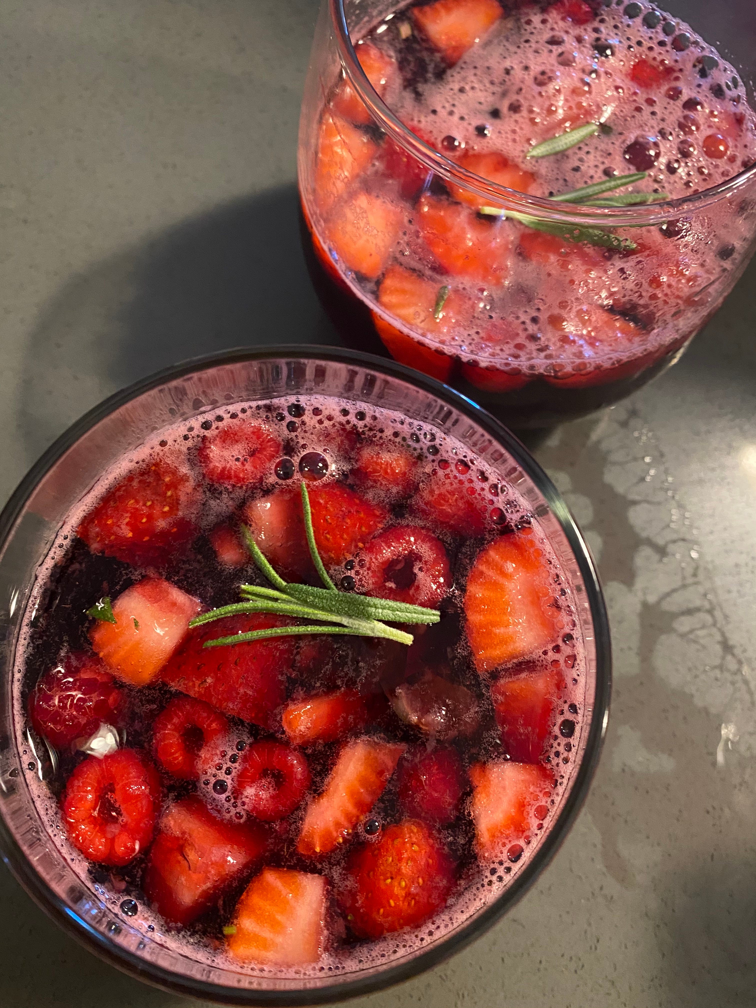 There you have it. This is not a recipe, or even really a “thing” — it’s just a spark of a concept. But man it is good. I also crushed up a few sprigs of rosemary and mixed them in, and Tom preferred his over ice. I plan to just keep replenishing it with stuff till the berries are gone; spoon some into the glass, of course, when you serve it. And don’t skimp; they won’t be good forever. Summer, in a nice little cup.